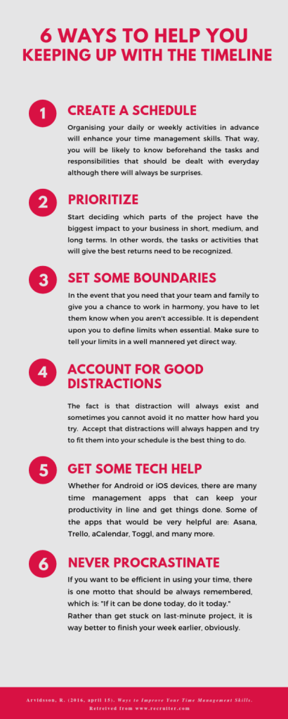 Although, time management skills can be improved and there are many ways to do it. Here are 6 of them: